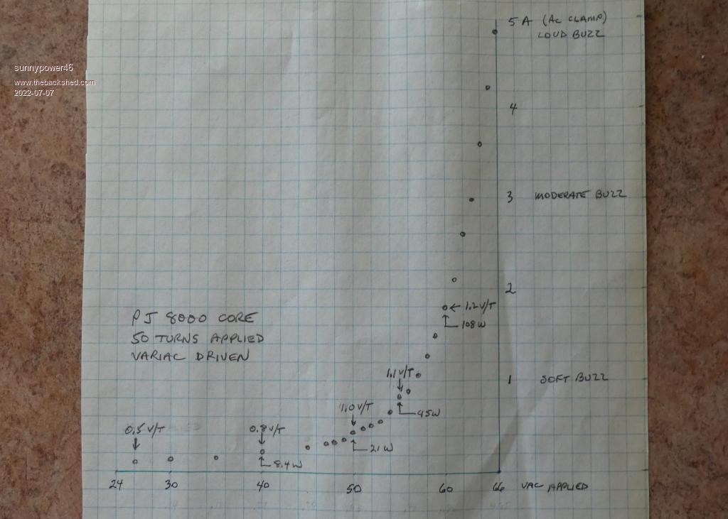 Meanwhile, I wrapped fifty turns of wire on the PJ toroid core and used my new variac. The resulting curve suggests 1V/turn would not be overly lossy.  So, 120+ turns either side of centertap is the number?  At 50v applied I noted .53A on the clamp meter, about 21 watts.  Getting into saturation further really hits the amps and sound hard.  This was a worthwhile learning experience for me.