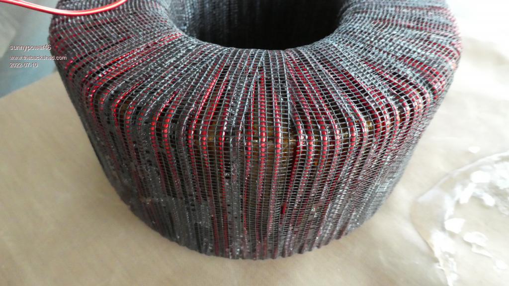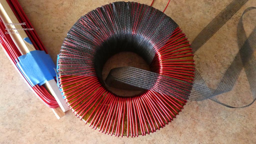 Some pictures to share.  First.  All 122 turns.  Wrapping with 3/4 inch fiberglass window screen strips I cut.  High heat resistant, easy to work with, somewhat stretchy, allows you to move the wires underneath, if desired, before epoxy.