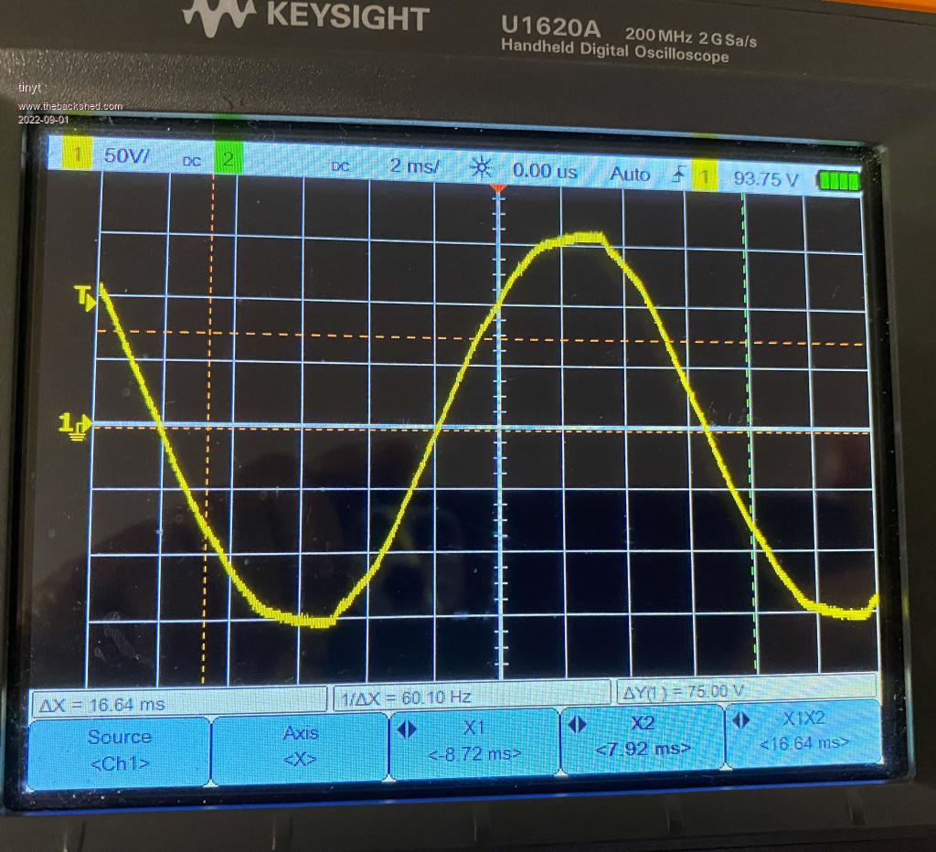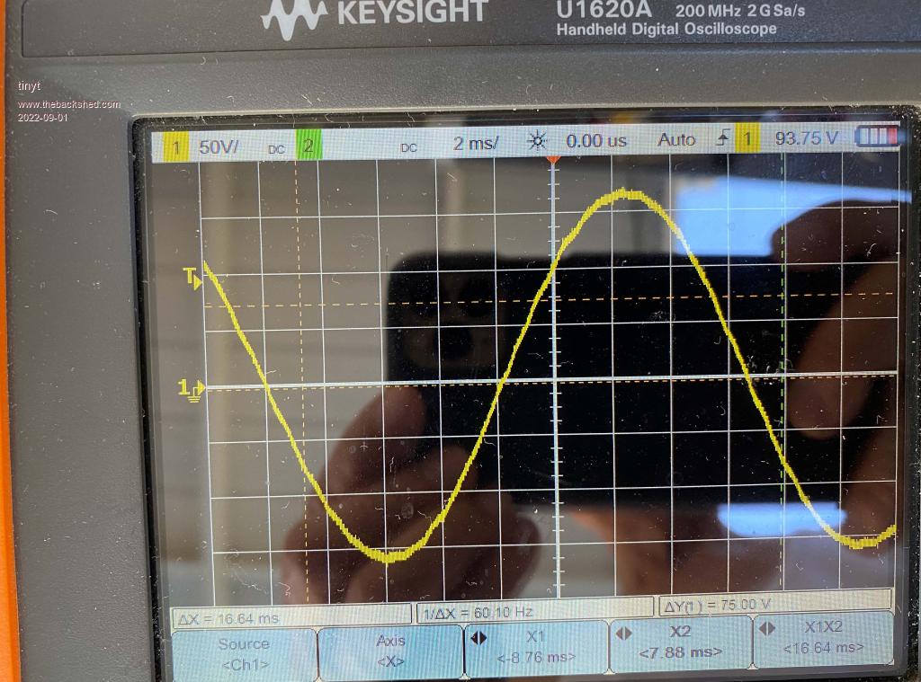 The waveform and voltage off the tranny are good, but the frequency quickly jumps around between 60.1500Hz and 60.2300Hz.  Apparently the microinverters see this as an unstable grid and won't play along.