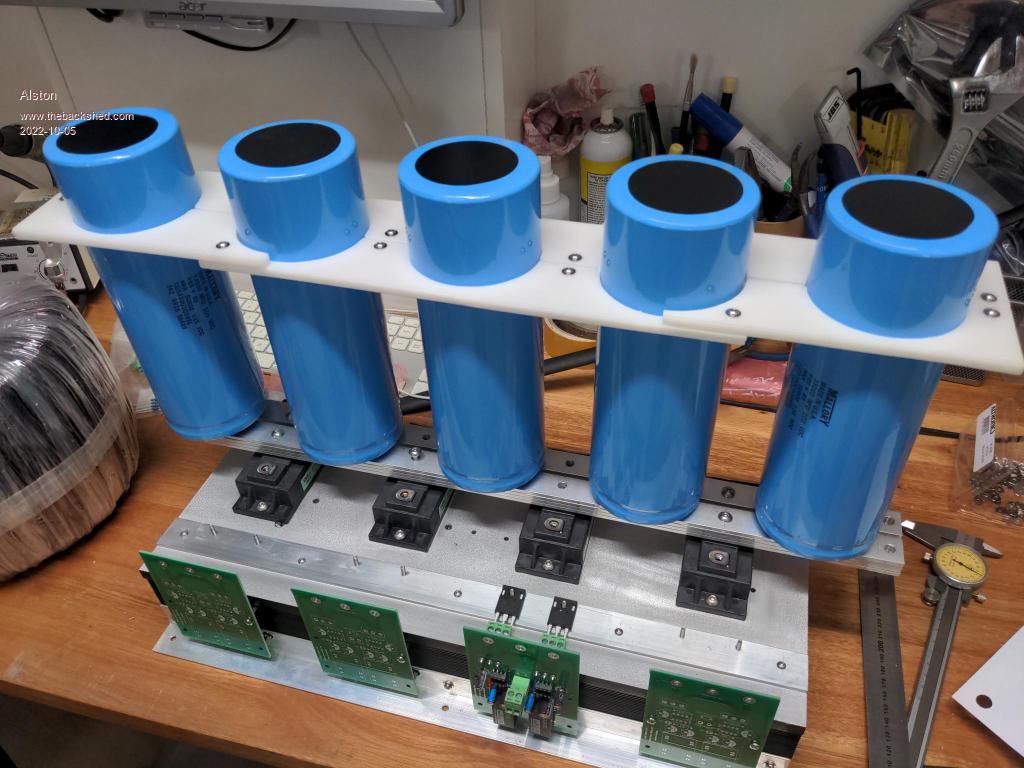 There will be 5 of these capacitors attached to the bus bar (which I have since cut and drilled) and I need to come up with a clamping arrangement which I have some ideas for. I need to have a look for some suitably sized plastic chopping boards as I will make them from that material. I am waiting on some imperial screws to arrive also so I can mount the caps.