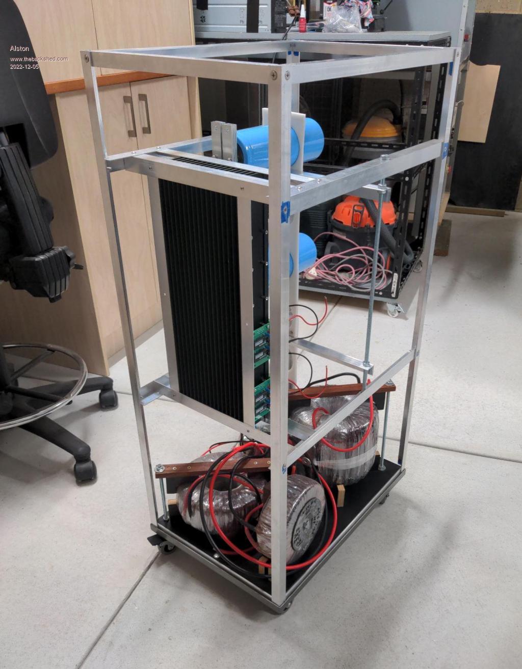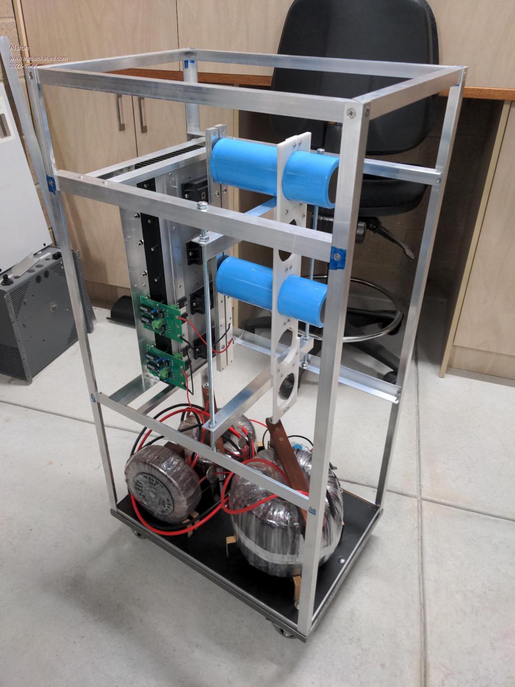 The enclosure so far. My original plan was to mount the heatsink facing down with the caps standing up but that wouldn't sit into the footprint of the Aerosharp lid so I had to turn it sideways. This gave me the challenge of how to mounts the capacitors. I used threaded rod and aluminum angle to mount to the plastic support to which takes the weight of the caps.