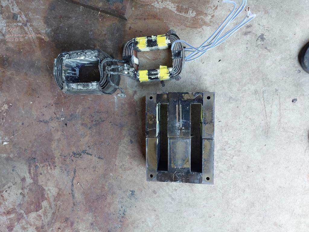 Now the centre boss is 58mm thick and there is 28mm of winding height so my thoughts are now wind the secondary on the E-core by using a former to wind the wire so it can then slip into the E-Cores then get welded back together also wind the primary over the top ensuring the 28mm height is kept in check. So if I can pull apart the old secondary with the 8x5mm wire that can be used as the new primary and just put some heatshrink over the wire to ensure isolation.