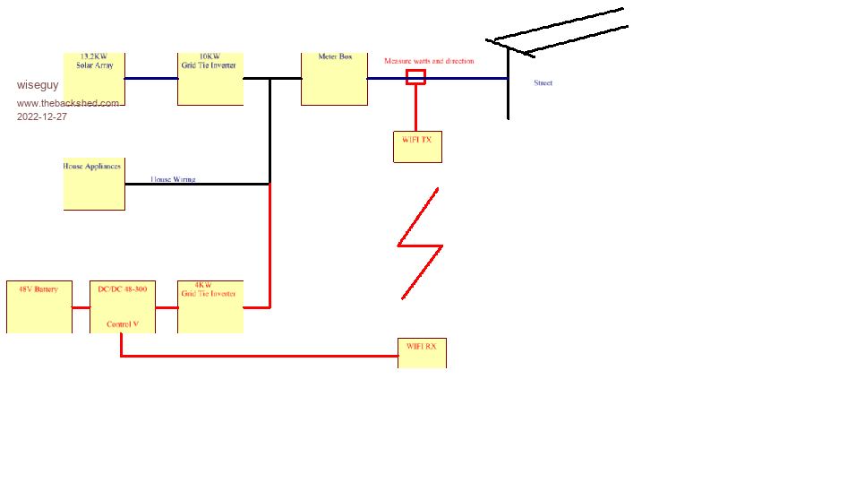 When we have oodles of solar the first priority before sending any excess solar to the grid is to charge the battery up, we can now use the power and direction unit to null the negative power now to the street until the batteries are fully charged up.  If the batteries ever go flat, if the second house feed inverter fails normal street power resumes/continues without any fuss or  interruption.