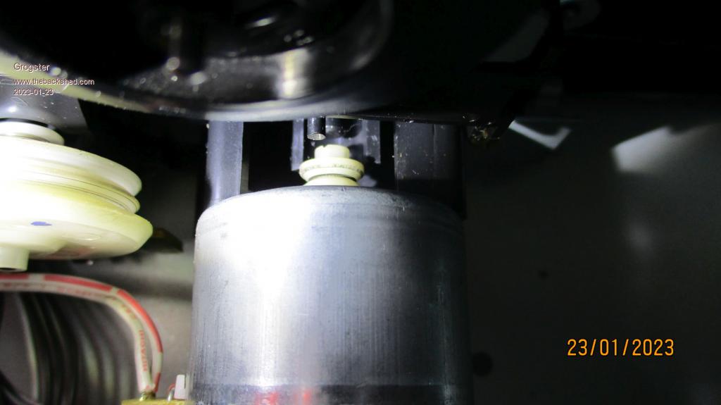 2nd photo shows pully, but note the black plastic behind and surrounding the pully, so you CAN'T simply push a new belt to the back and around the motor pully - the black plastic BLOCKS you from doing that.
