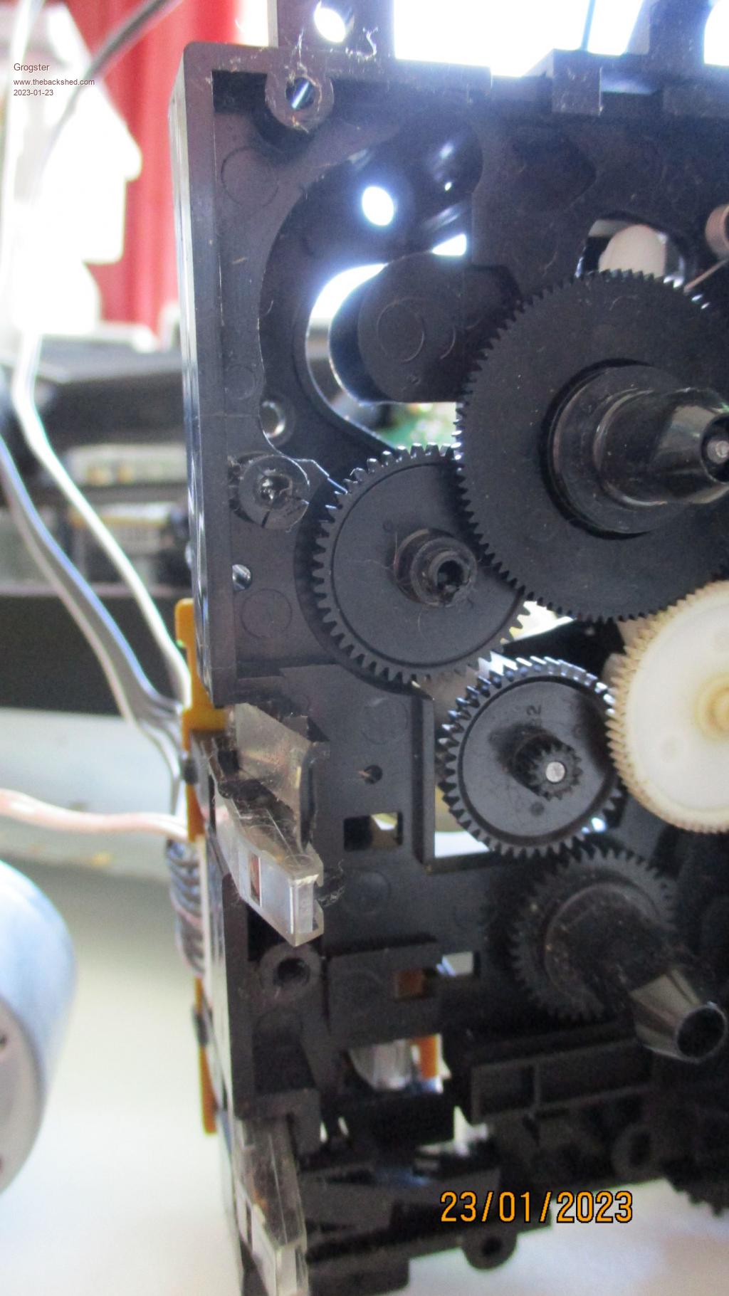 Photo 3 shows the deck out of the front panel, and the rear(with respect to cassette) cover removed, showing gears etc, and access to the motor screws.  Motor removed in this shot.