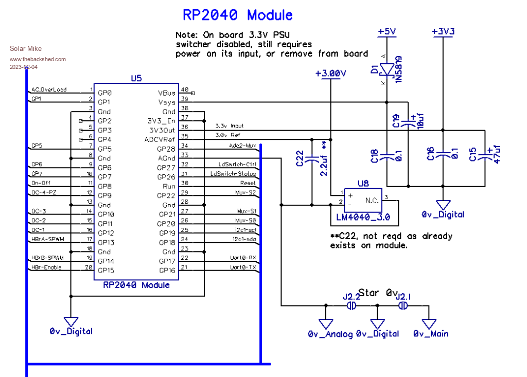Here we see the RP2040 module connections, not all pins are used, some are output to terminal strip for generic use. The on board switching PSU has been turned off and replaced by analog DC inputs, noting that a 5v rail has to be present in order to disable the PSU chip, or it could be unsoldered from the pcb.