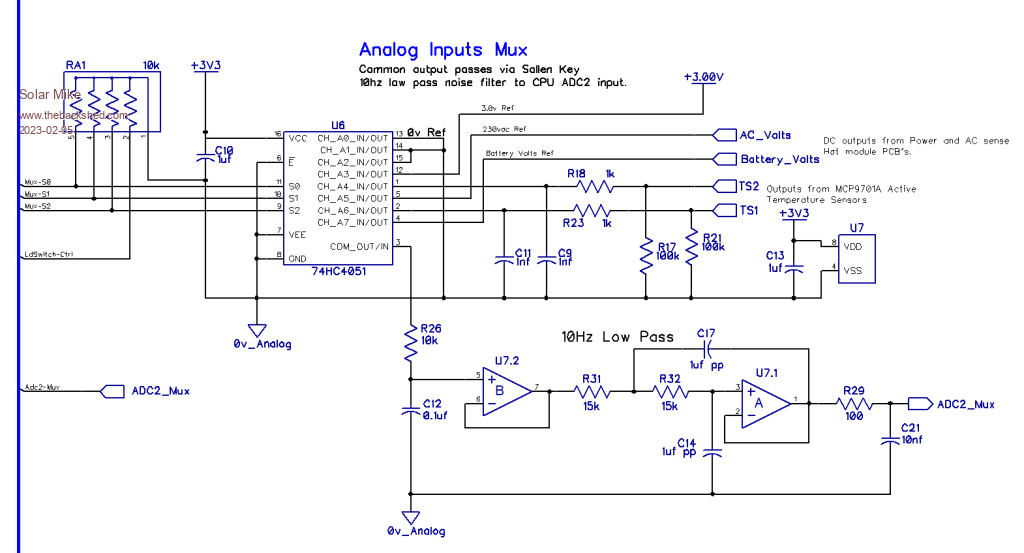 Continuing with the schematic, here is the analog IO part, the Pico doesn't have many ADC inputs so it's easier to implement additional ADC's by using a Mux, here I have used the HC4051 with 8 inputs and 1 out, a 10 Hz Sallen-Key low pass filter is used on the mux output to get rid of any noise prior to the CPU input.