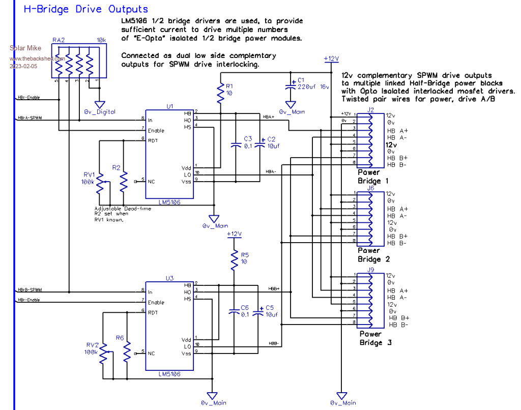 The LM5106 drivers have plenty of capacity to drive multiple 1/2 Bridge power boards using the complementary H0-L0 channels as drive signals to the "E-Opto" inputs of each power module - which are arranged in an interlock, so cross conduction in the mosfets can never occur; they also lockout any outputs on low voltage and share a common "Enable" input signal from the CPU. The dead-time adjusters RV1\2 once set can be replaced by fixed resistors. I have only allowed for 3 full power bridge modules on spring sockets J2,6,9, however they can be daisy-chained from a single drive socket if required.