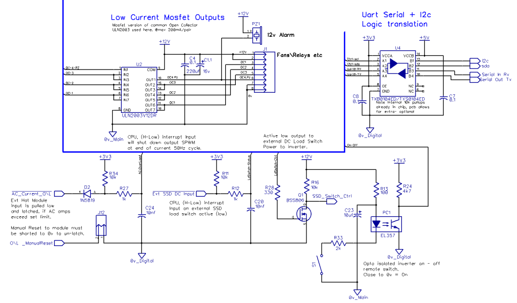 Other IO: The mosfet version of the common open collector ULN2003 driver is used here for low power fans or relay outputs, saves a lot of components using them. Optional serial or I2c data connection to a 5v LCD display is provided by a TXS0104 logic translator. A latched AC current overload input is used to shut down the inverter by the CPU at the end of the current 50 Hz mains cycle, so magnetic flux remnants are not left in the transformer core. I'm using my 300A SSR to switch power to the inverter, so an output is provided for that. The main on\off switch is via an opto-coupler, allowing longer leads to the switch.