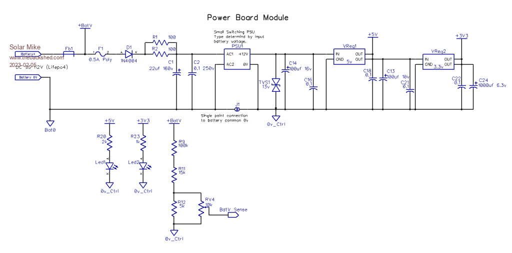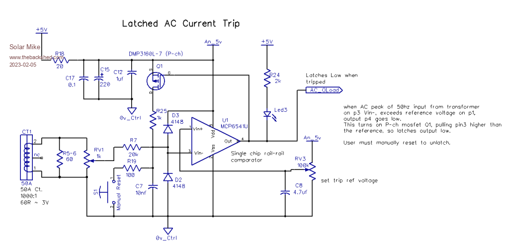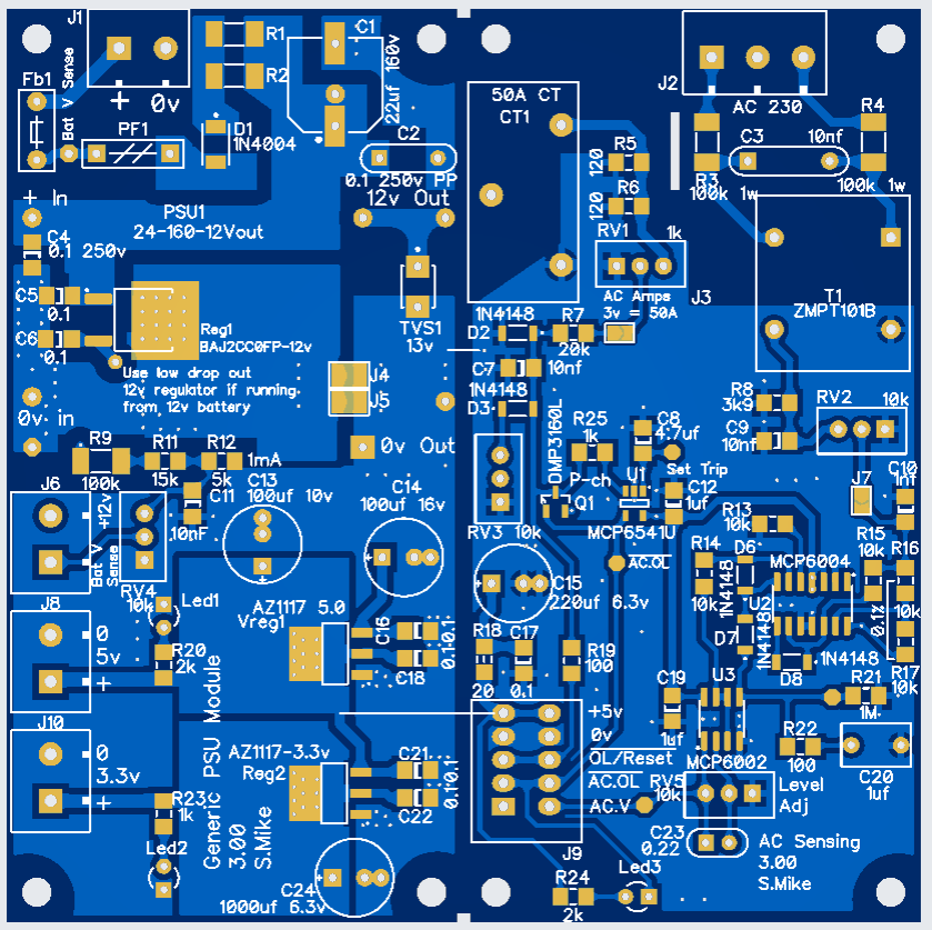 AC Sense PCB: 50 x 100 PC, sits above the DC power board and has both AC current CT and voltage transformers. The output of the 50A CT is set to approx 3v by selection of suitable burden resistor R5-6, a rail\rail single comparator detects the positive going peak of each 50 Hz AC and if its voltage input on P3 exceeds the set point RV3 on P1, the output is pulled to 0v, turning on Led3, biasing on P-Ch mosfet Q1 and further pulling the input P3 to 5V, latching the output low. A manual reset after the overload event reverses the operation.