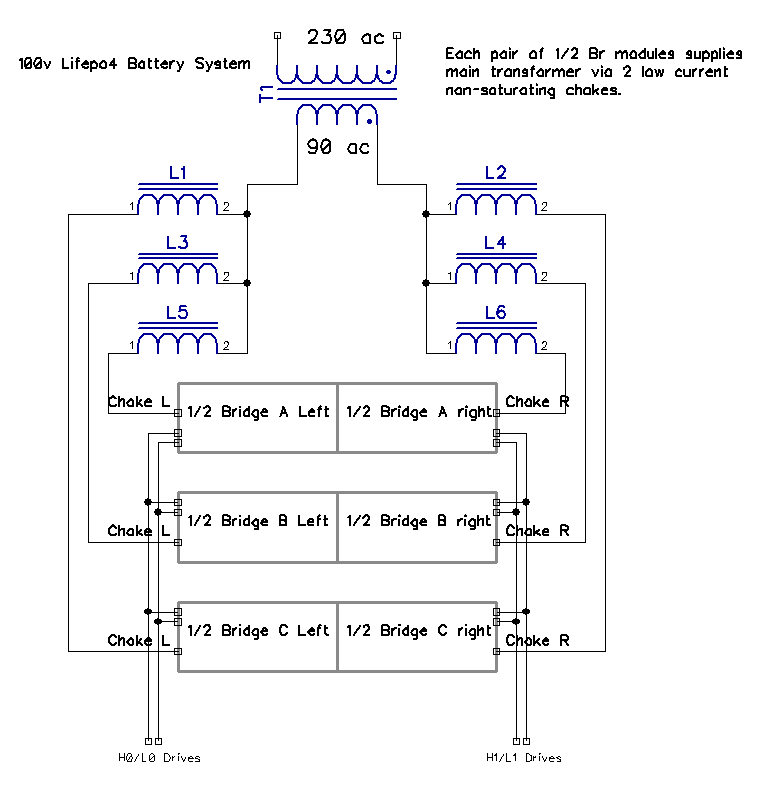 Here is a block dia of the main inverter output: The identical left and right 1/2 Bridge power modules each contain 2 parallel mosfets in each H0 - L0 half + 2 large storage electro's, groups of these pairs are daisy-chained for drive input and link to the main transformer by a small powdered iron core, conservatively allowing 50 amps current per pair, modules can be added to achieve the desired power output; that's the theory anyway