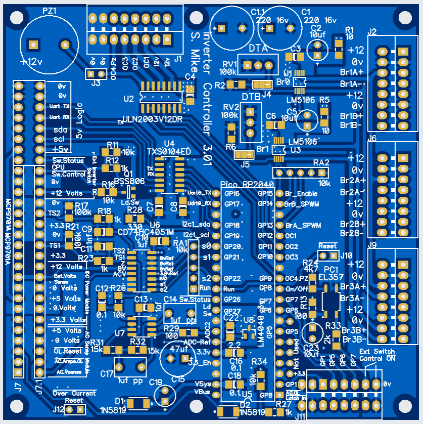 Its been a good while since I looked in my box of inverter half finished projects, specifically the PI Pico RP2040 Controller; the original version can be improved upon and implemented in a more modular fashion. With JLCPCB lowering their prices of 100mm footprint 4 layer boards to $7, it makes better sense to alter the circuit somewhat and redesign for 4 layers, achieving better noise and EMI performance.
