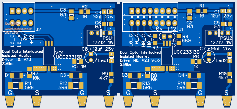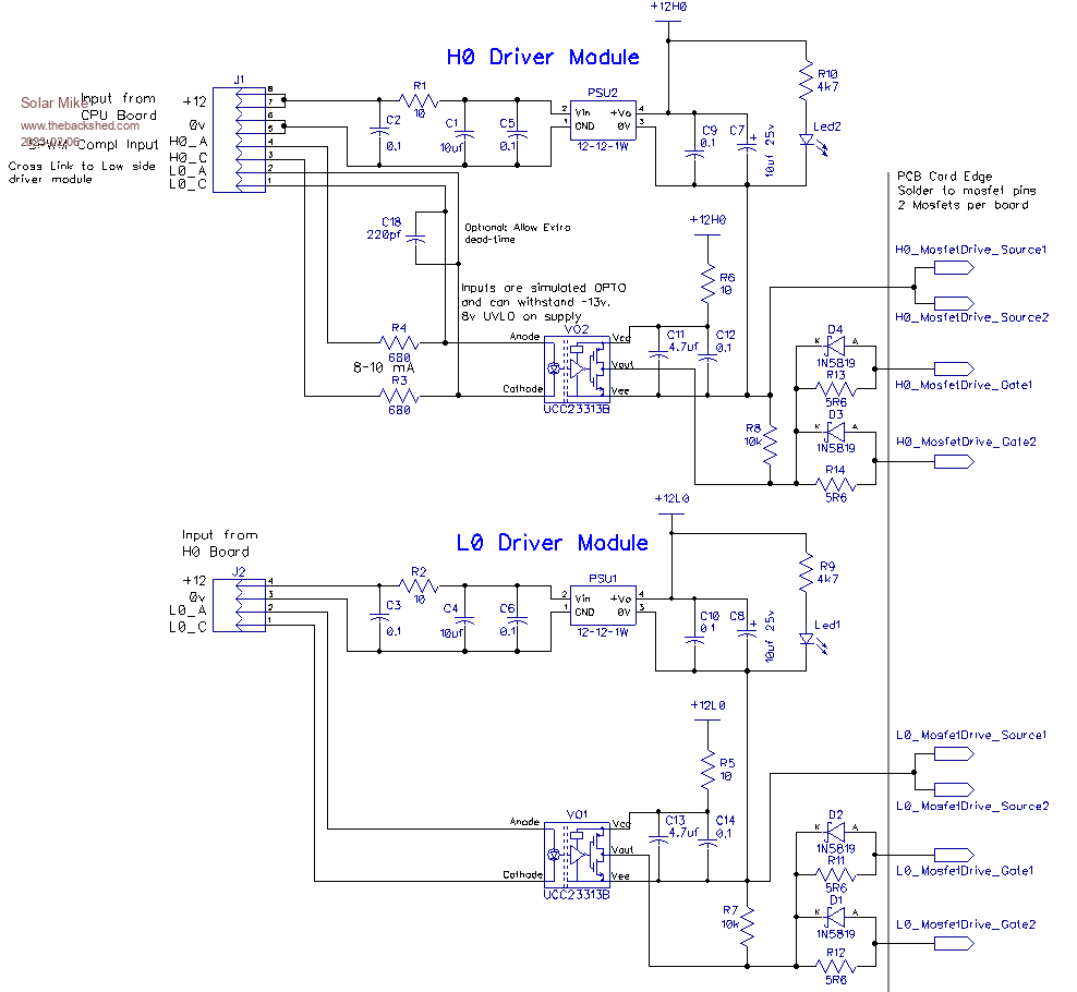 Power Board Mosfet Drivers: Small 45 x 45mm pcb's containing the "E-Opto" isolated drivers blob solder vertically directly across the mosfet pins, this achieves short direct mosfet drive signal paths. Each module has its own 1 watt 12-12v isolated PSU for total isolation back to the main CPU board. The pcb's are 1.2mm thick and easily cut in half to give the 2 boards, the lower L0 driver links to the H0 driver by twisted pair wires. Note the lower L0 SPWM drive is reversed from the H0, thus creating the inter-lock drive, there is provision for adding a dead-time capacitor, C15, I won't be using it as the dead-time is created on the CPU board.