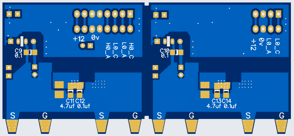 Here is the layout for one 1/2Bridge power module, it uses four mosfets, two in each H0, L0 positions, they mount off the pcb bolted to the case back panel of 5mm thick alloy. A minimum of two modules are required to create a single H-Bridge, copper bars bolt between modules for +100 and 0v. I haven't a circuit for this part as its more mechanical and somewhat self explanatory. Obviously components rated for whatever battery voltage will be used, snubber components are there incase, I will be leaving them off initially.