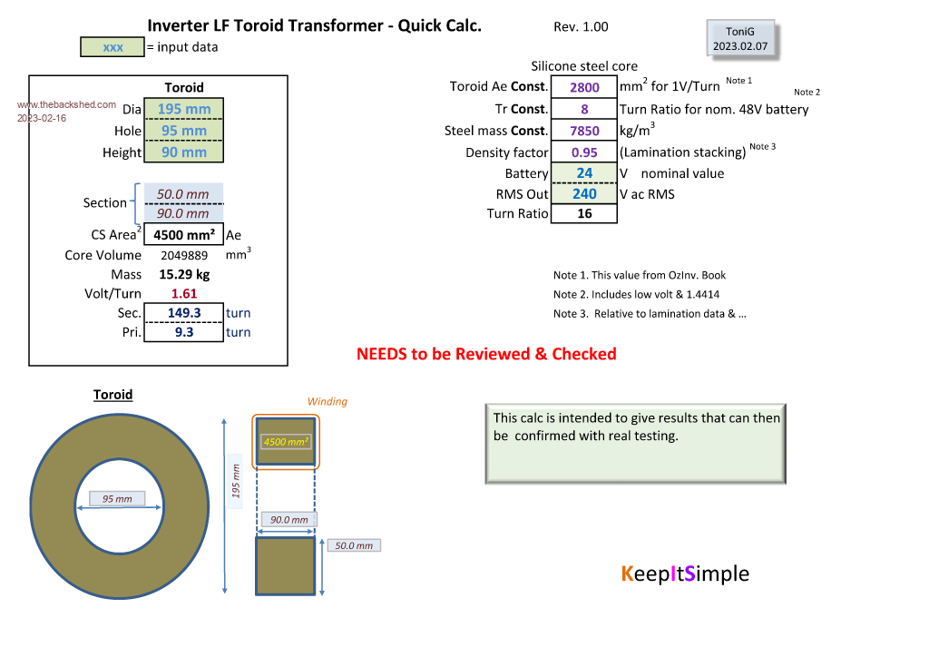 I made a quick transformer calc. in excel when I was evaluating different cores. It doesn't include wire fill, just gives Ae, V/T & winding turns. I would like if some experienced builders can check my calculation & constants as I don't have anything in the real world yet to verify against. Thanks Inverter ToroidTransformer Calc V1.0.zip ![]() Edited 2023-02-16 19:46 by tonigau |