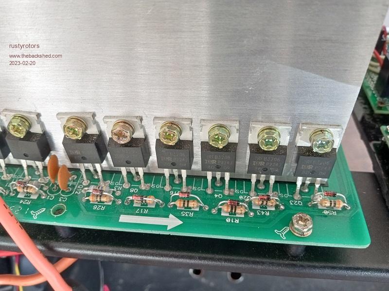 The mosfet board had 24 IRFB3206 fets, each with 47 ohm gate resistor, no reverse diodes. To work better with the EGS002, I swapped the gate resistors for 30 ohm and added 1N4148 reverse diodes. i figure that should keep current draw from the IR2110s under 6*12V/30ohm = 2.4A