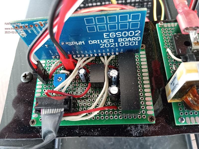 first had to fix the snap crackle pop bug on the EGS002.. i removed U4 and shorted C19 and C24 to disable overcurrent protection. i made this super minimal board for adapting the EGS002 to the aims mosfet board.. it has 5V and 12V supplies and a pot for adjusting AC output voltage