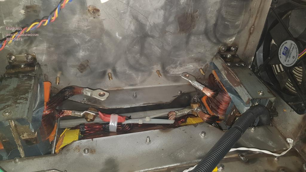 Gary, I do back charging (via GTI) here on a daily basis, often 2KW or so if the sun cooperates. The nano inverter (latest code) *does* have issued with that, the wave form has a reverse kink (smaller than that on your sketch above) only on one side of the sine slope. That does produce noise in the nano inverter but it keeps on running fine. There was also noise from my GTI but I seem to have cured that by back feeding via an isolation transformer. I use a standard 3KW Aerosharp toroid (unmodified) for that. GTI to 230V primary, Nano inverter to 250V secondary. This is a recent addition and so far no problems. On my 6KW (2 stack) nano inverter I have a choke in each primary leg. One side has a 180uH choke, made from double large aerosharp chokes (made into an E core) with 18 turns of 40mm sq. The other side has a 2 stack powdered iron toroidal choke, cores similar what KeepIS uses. (C8610125) That one has 40uH, 7 turns of 25mm sq wire. Without back charging (when the battery bank is full) that inverter is virtually silent now. The microwave does still mess up the sine wave. Fitting a 3 stack toroid & parts into a doubled Aerosharp case does look like a challenge, I'm surprised you persisted. I've given those ss boxes a miss long ago, have still some taking up space on the shed shelf though. Its not that hard to weld up an angle frame and make your own enclosure to whatever dimensions you want. You can see how on my (tinker's) built. |