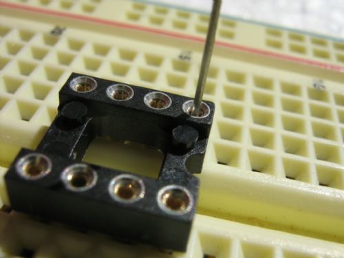 Vasi, I'm not sure why you want to use both an 8-pin DIL socket together with your SMD-to-DIL adapter, but if you want to do it like that, try finding a different 8-pin DIL socket: not the one you have now, with the turned pins, but the cheaper variant with the pin-sockets with spring action (http://www.voti.nl/ir-3/pics/dil14-big.jpg); these will be much less critical w.r.t. wire size. Peter. |