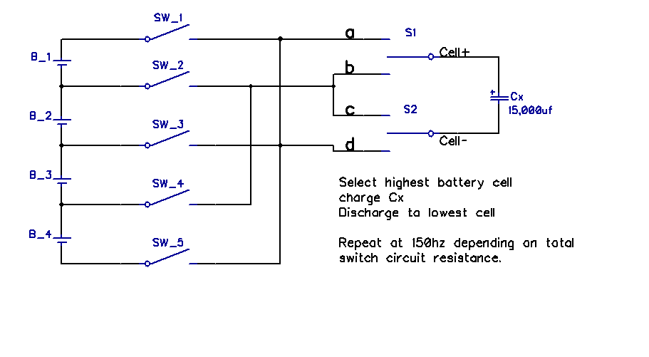So a bit of DIY is called for, here is the basic dia for a simple concept of removing energy from the highest battery cell and adding to the lowest cell using a large value low esr capacitor bank.
