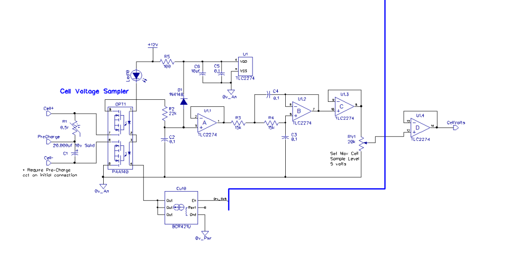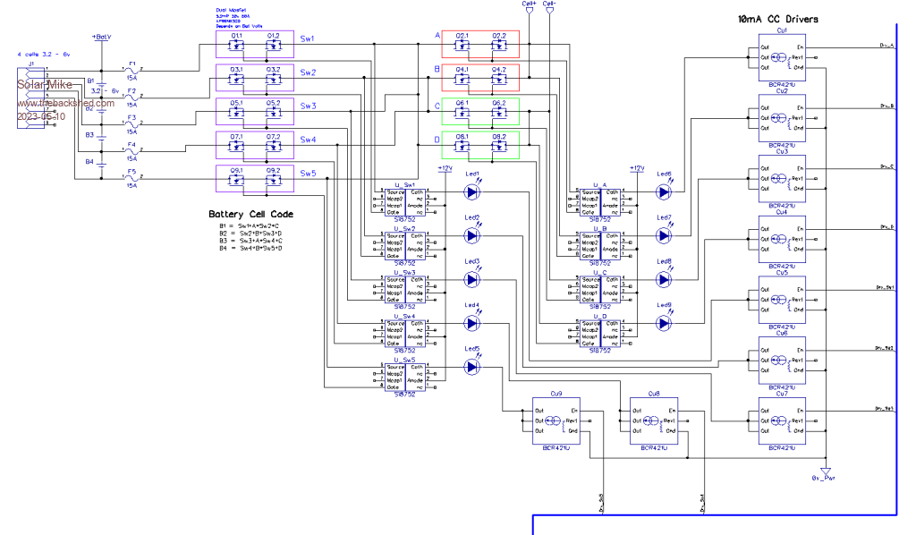 Schematic: I drew out 99% of the circuit then split it out into the main BMS and Led display boards, most cpu IO out lines have a 20k pulldown resistor (array) not shown on the schematic, also not shown are the common Picaxe programming bits or crystal.