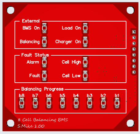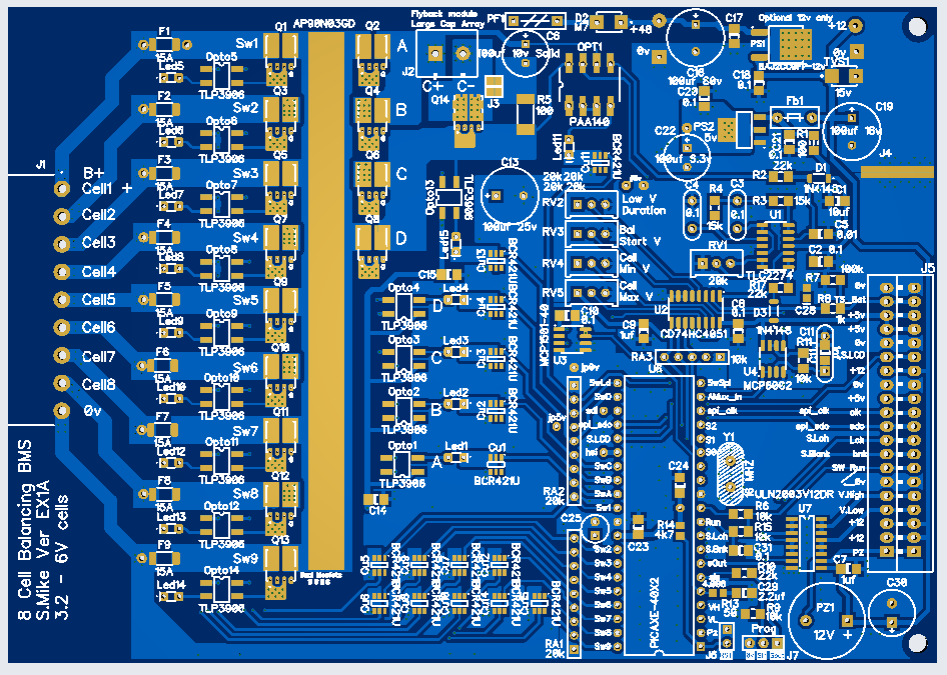 Finally found some time to draw out the schematic and do a pcb, I'm going to have a play with an 8 cell balancing BMS design; will be interesting to see what difference having either a capacitor array 20,000uf discharging from the highest voltage cell to the lowest; or using a small boost inverter discharging the highest cell into the whole battery bank.