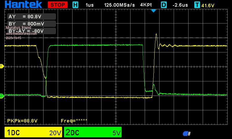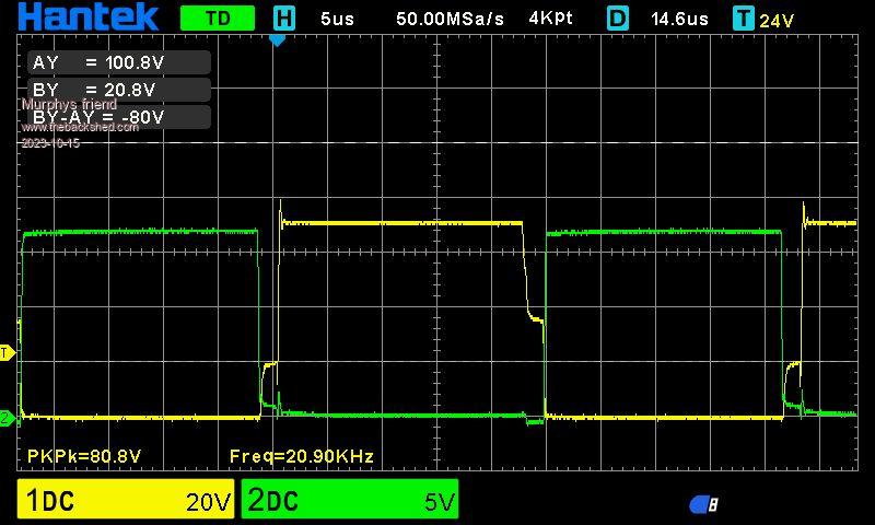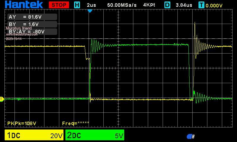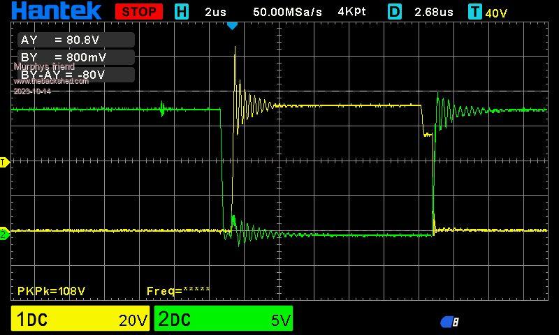 Also, have a play with the vertical position controls, to offset down channel 1 so that the narrow step lines up with channel 2's zero position. And increase ch1 gain to 5V. This will then have ch1 (Yellow) showing the same amplitude as ch2 (Green). The ringing on ch1 will be huge though. I think the primary winding/choke/toroid is wanting to oscillate. Or maybe the totem pole drive is doing it. Or something else.. We will find out what it is.