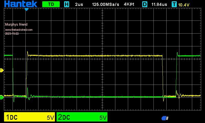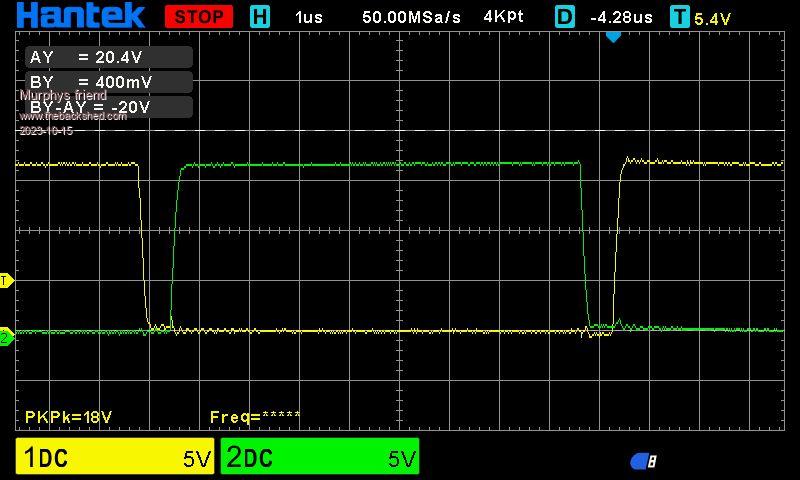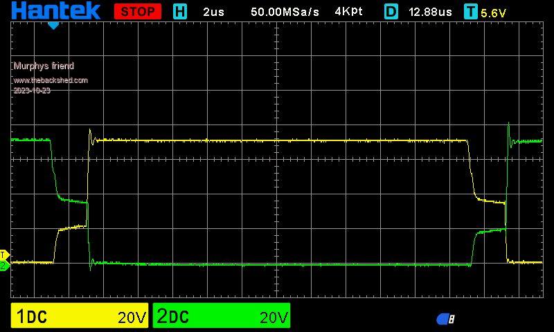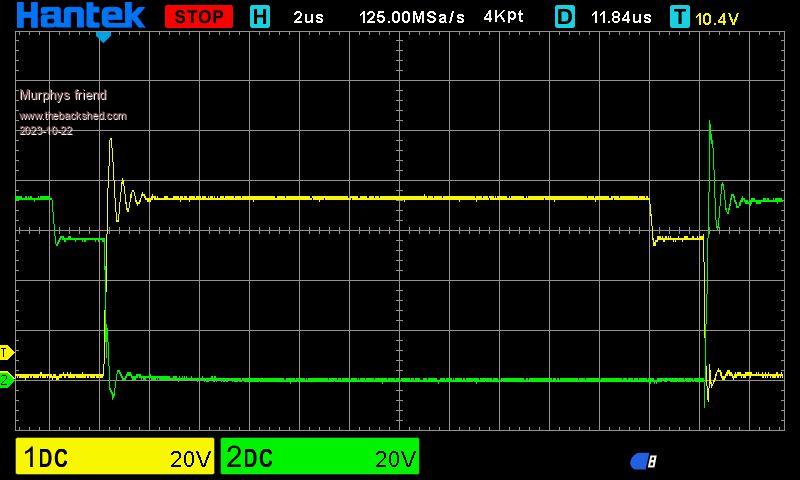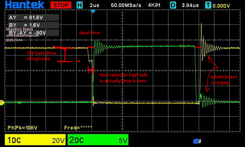 Then I connected the probes, yellow trace = HI side gate, green trace = LO side gate with ground to negative power.