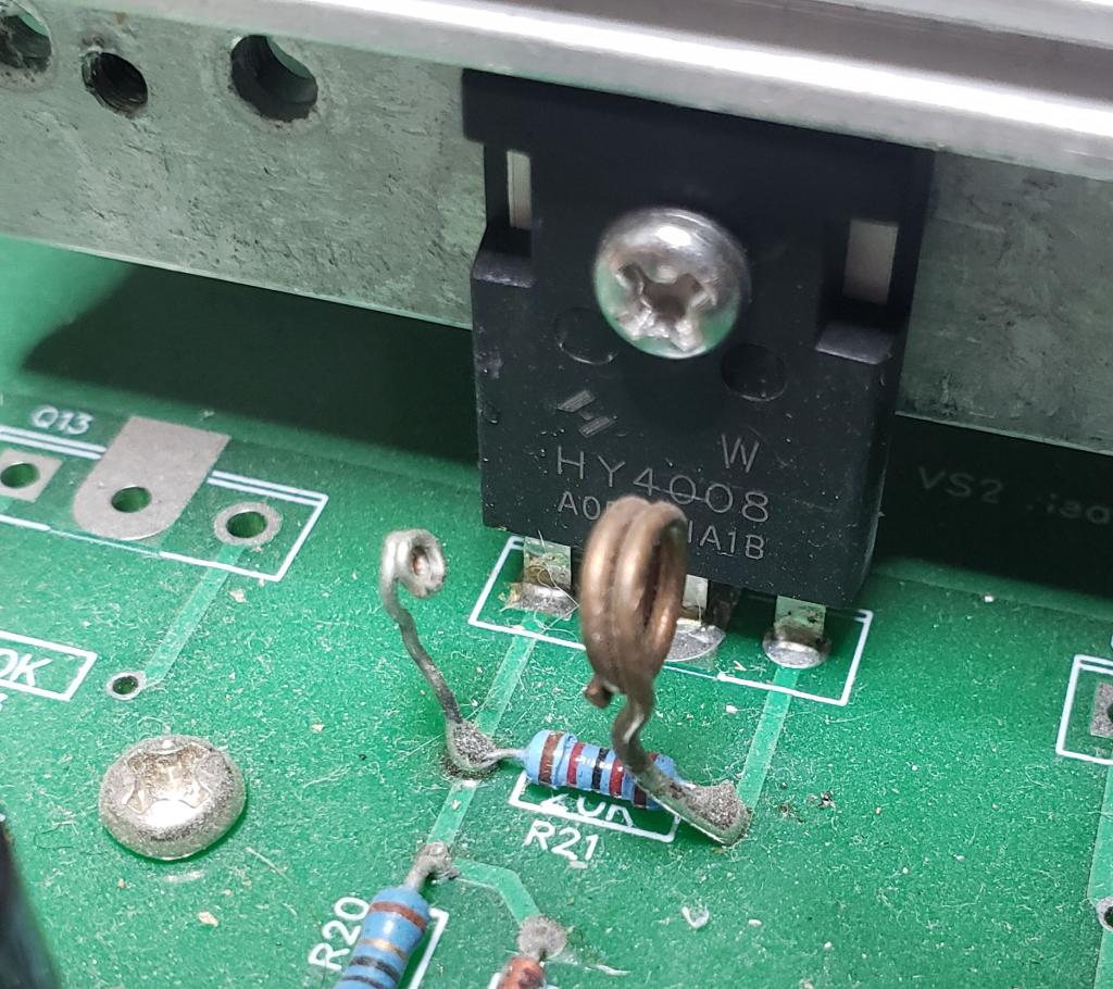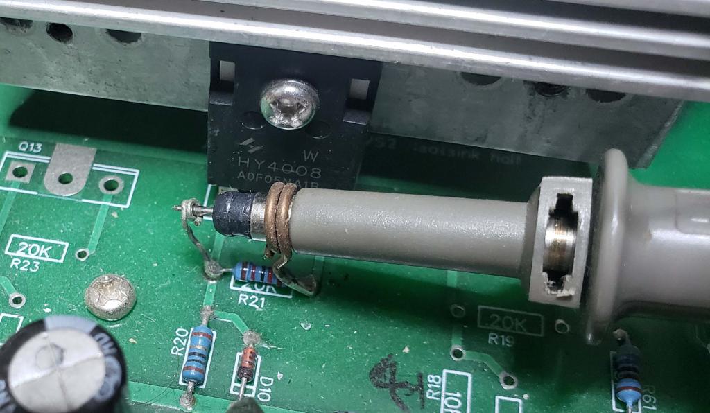 For the next pic I applied power to the mosfets, connected a small load (10W) and fitted a ferrite bead at each drain leg. This seems to reduce the ringing a fair bit.