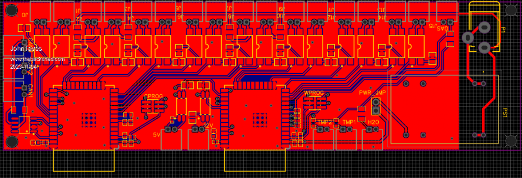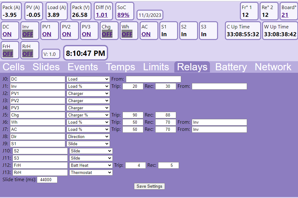 The controller board has 2 esp32s. I got tired of trying to get a single esp32 to do both the wifi and bluetooth. There are 16 total SSR outputs that are used to turn on/off loads and charging. There is a CAN bus that I use to capture the data from 2 Reidon SSD digital shunts. One shunt measures the pack voltage and amps, and another measures the solar amps.