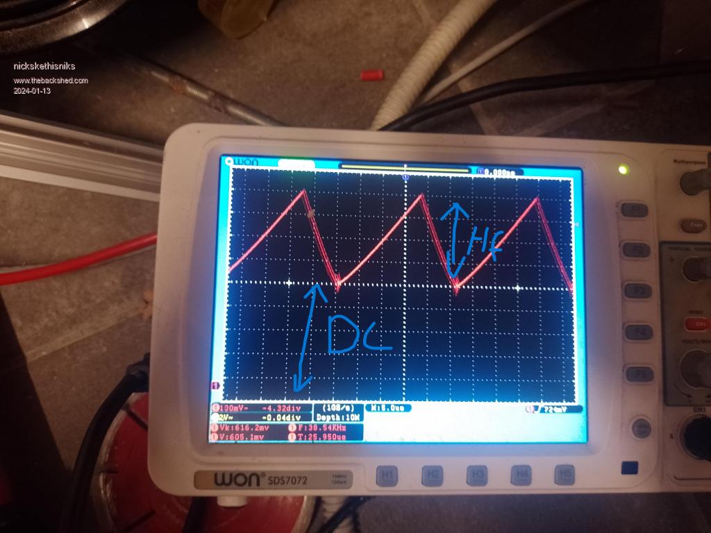 Something else to point out for those that don't know yet, the current in the inductor has 2 components DC+AC, the skin effect is only present in the ac component. The higher the inductance, the lower the ac component. Typical current waveform of the inductor: (100mV equals 1A) ![]() You can get away with solid wires you might think, but when using gapped cores something else gets introduced, "fringing". Fringing . Edited 2024-01-13 05:43 by nickskethisniks |