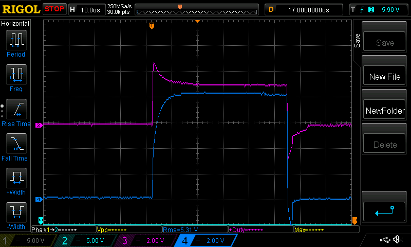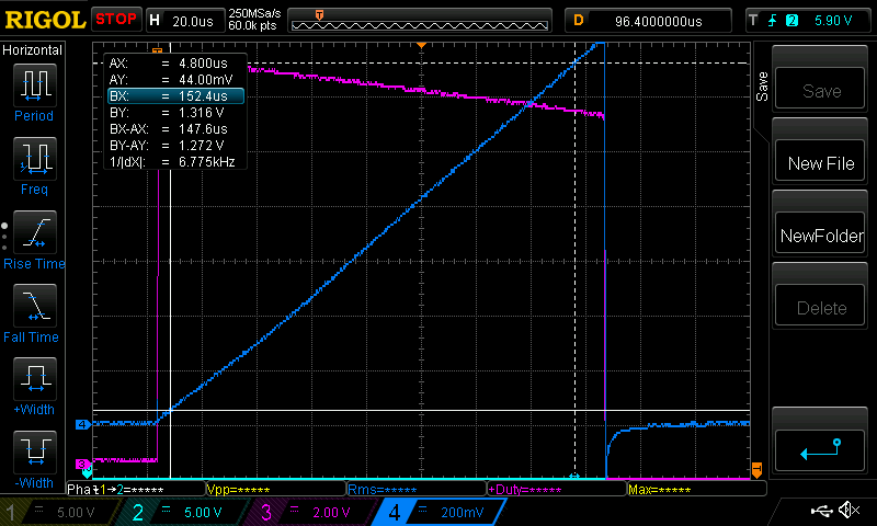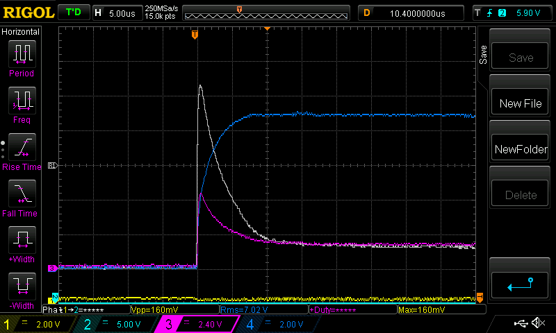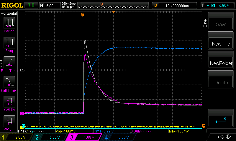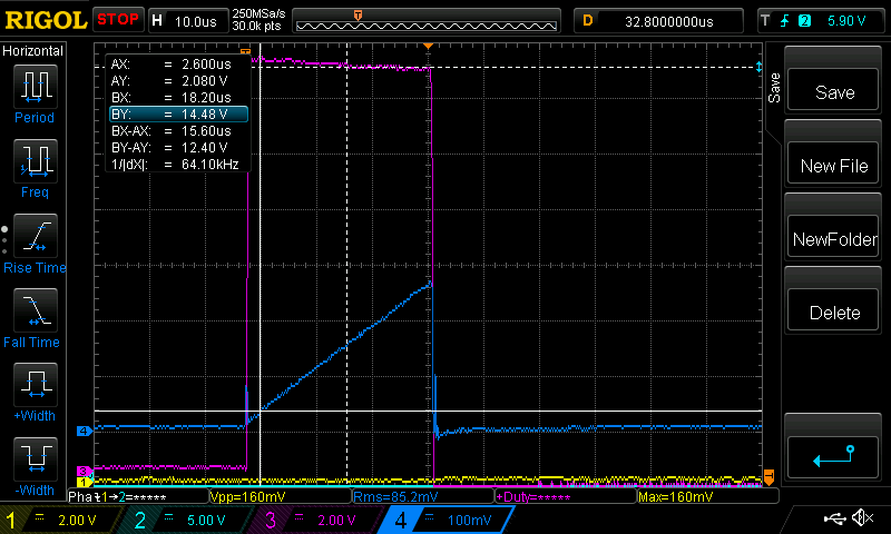I know, the risetime of the FET is significant. Changing the FET's Gate resistor from 47R to zero does not change anything after the first 2 uS, it just adds a large amount of high frequency oscillation. The above tests were done with the 47R Gate resistor, to keep the traces looking smooth. here is the same 38.9 uH choke (using 7 turns with a TDK ferrite E core) but looking at the first 30 uS of the pulse. ![]() 36.6us 0.282V on the current sense 14.5V across the choke at the mid point of the pulse (and 0.0193V/Amp for the current sense) 14.6 Amps L = 36.6us x 14.5V / 14.6 Amps = 36.3 uH that's a bit better. Maybe the ferrite core is non-linear? Edited 2024-01-09 21:31 by poida wronger than a phone book full of wrong phone numbers |