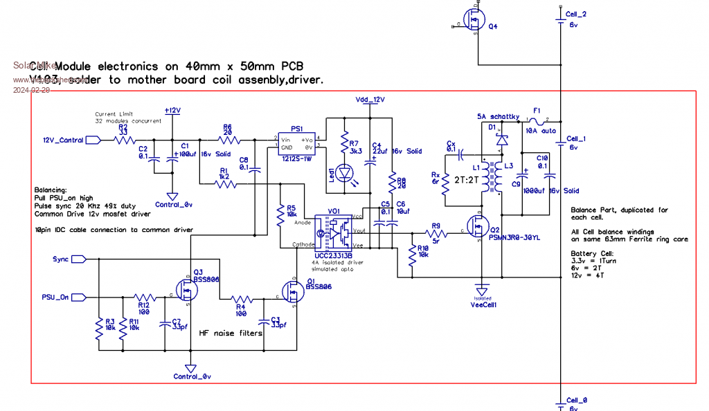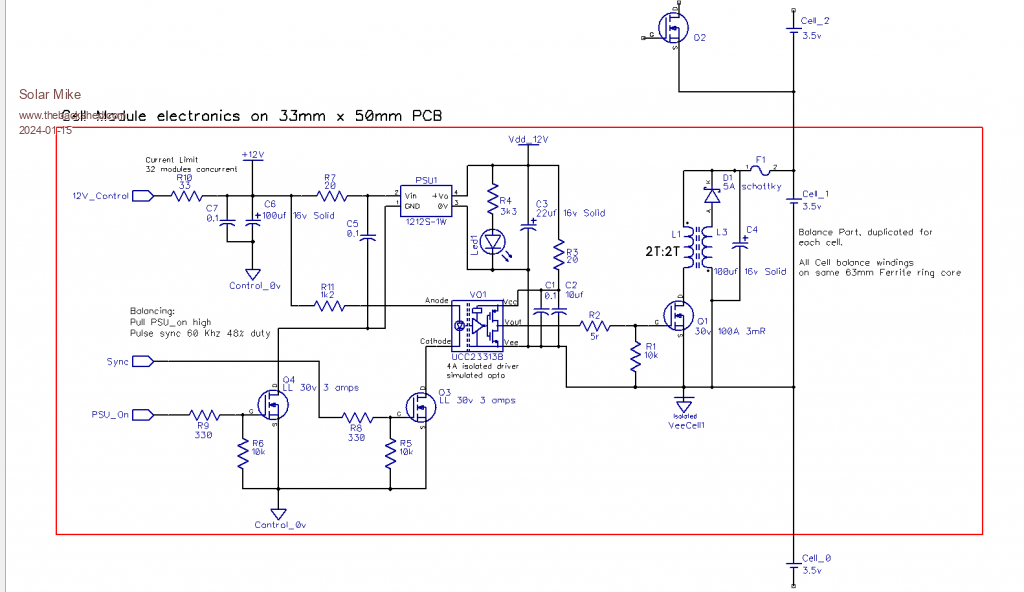Here is the experimental schematic for the electronics for balancing one cell, this is on a small 33 x 50mm PCB that sits on a larger mother board hosting up to 8 balancing modules, a large high mu. ferrite core sits in the middle and links all modules together.