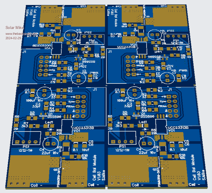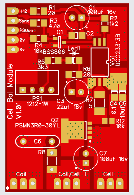 I will be eventually driving 32 Lifepo4 cell modules for my 100V bank, so have used a 12V mosfet driver chip for the two main outputs to supply enough drive current.
