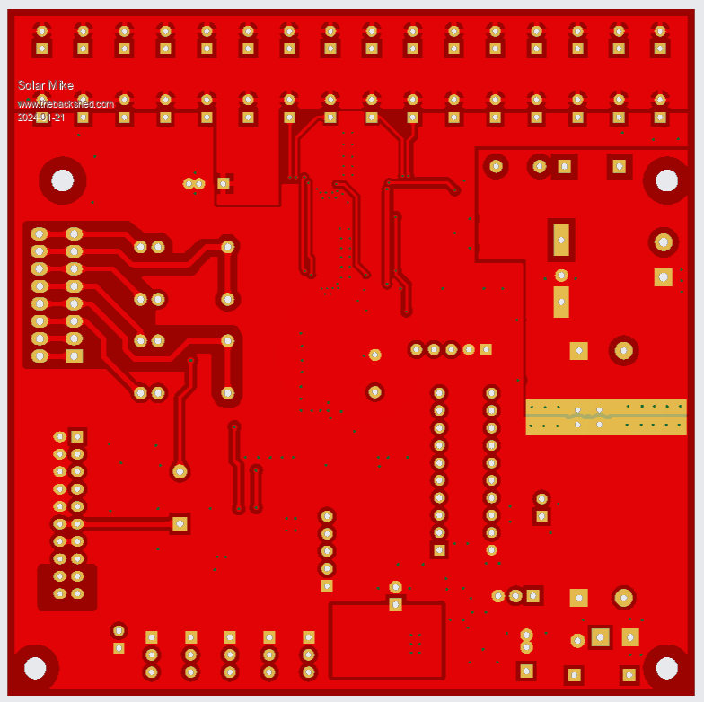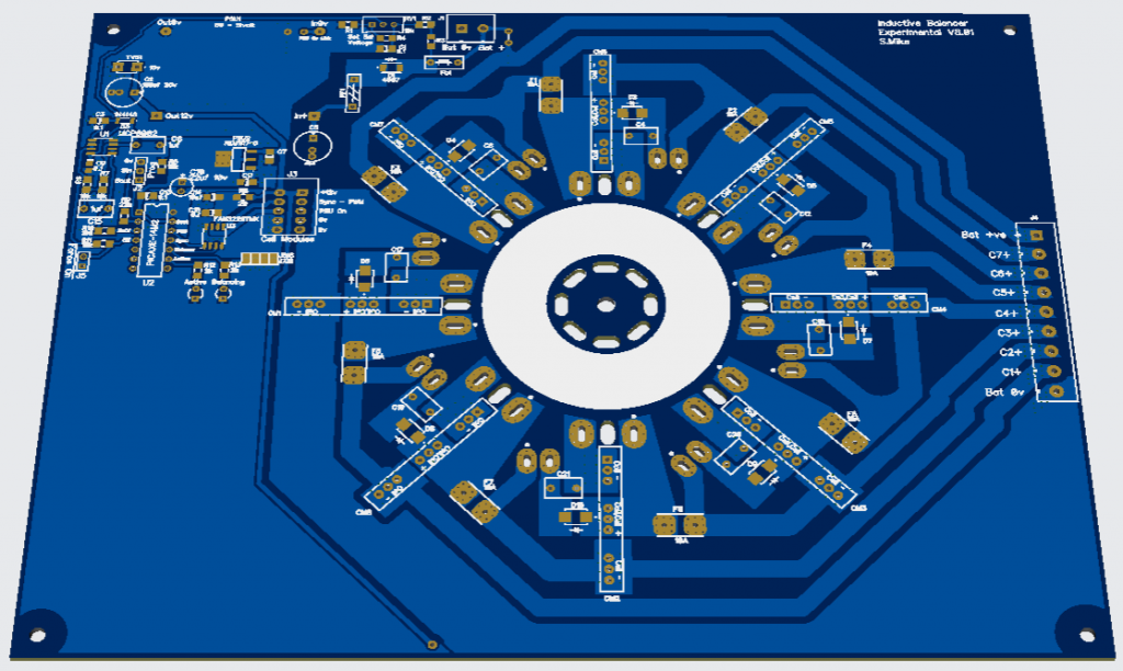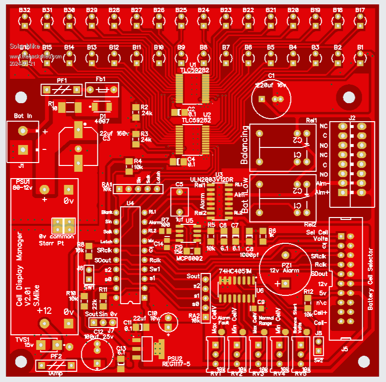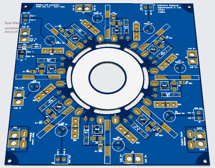 Power pcb's will get here next week; meanwhile have completed the cpu driver board, 78 x 100mm, it connects to the multiple cell interface boards linking each battery cell to the big ferrite conductor. I want to connect it to 3 x 48 volt banks of 6V lead carbon battery cells.