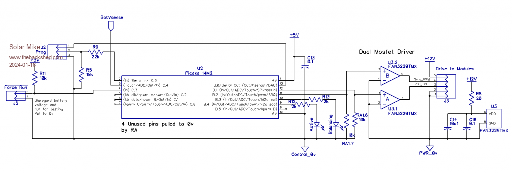 Have used the old Picaxe 14M2, basically it compares the 48V battery to a set point and turns on the sync pwm to the cell modules. Have allowed for a couple of switch contacts to switch to Auto or Forced run. The Forced run input could be connected to a BMS.