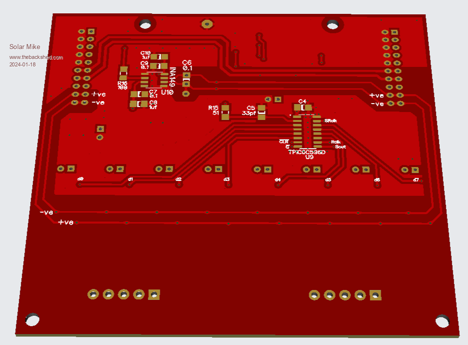 The cell monitor board would work better if it connected to a module that allowed a visual display of each battery in the bank. To keep things simple, a row of leds 32 of them will cover my requirement for a 32 cell 100V bank monitor, leds are placed in two rows and driven by two 16 bit TLC59282 constant current serial input shift register driver chips, these have a universal serial input format similar to the 74HC595 and have a single resistor to set the current for all leds.