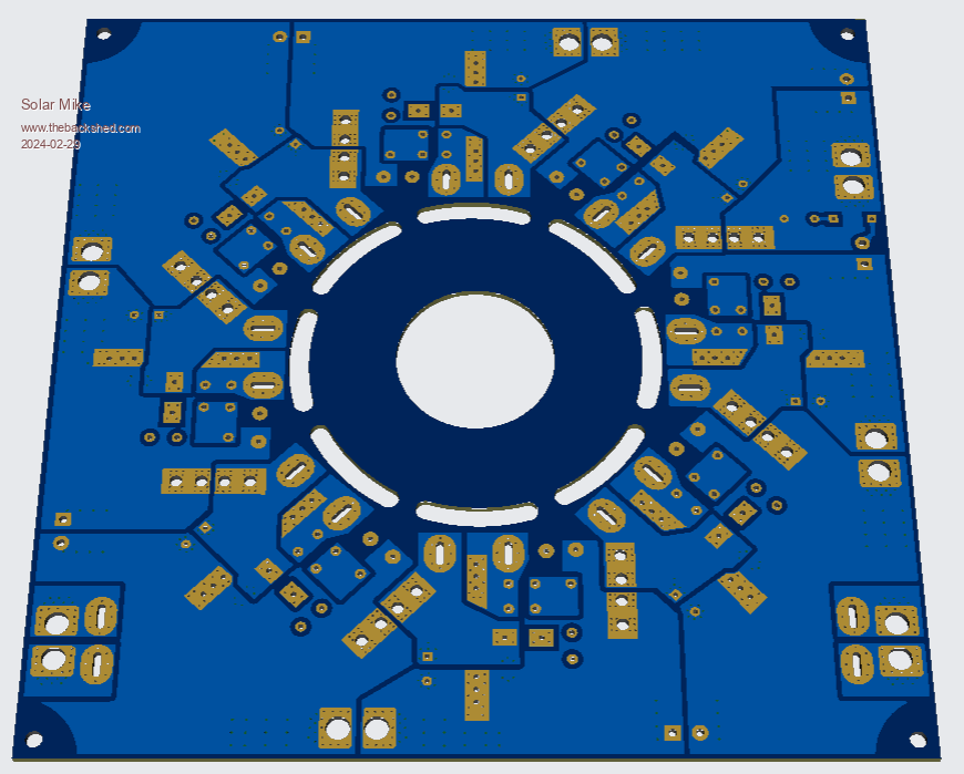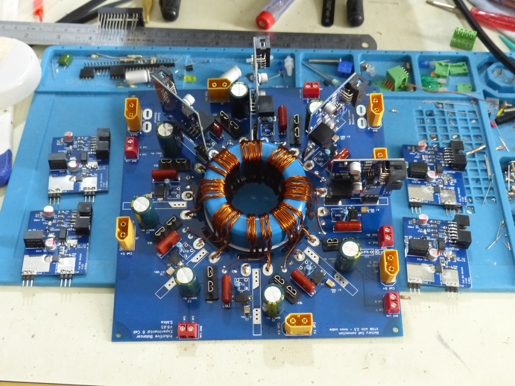 Here is the final layout for each balancer main mother board, the 8 mosfet inductor drive modules solder to the pcb, sync drive pwm connects to them by a common 10pin IDC cable; a large 63 x 35 x 25mm ferrite core sits in the center, held in place by the coil windings.