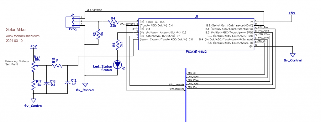I have used a Picaxe 14M2 CPU to measure the balance start voltage and generate the module drive signals, haven't drawn the circuit of this yet, but will do so.