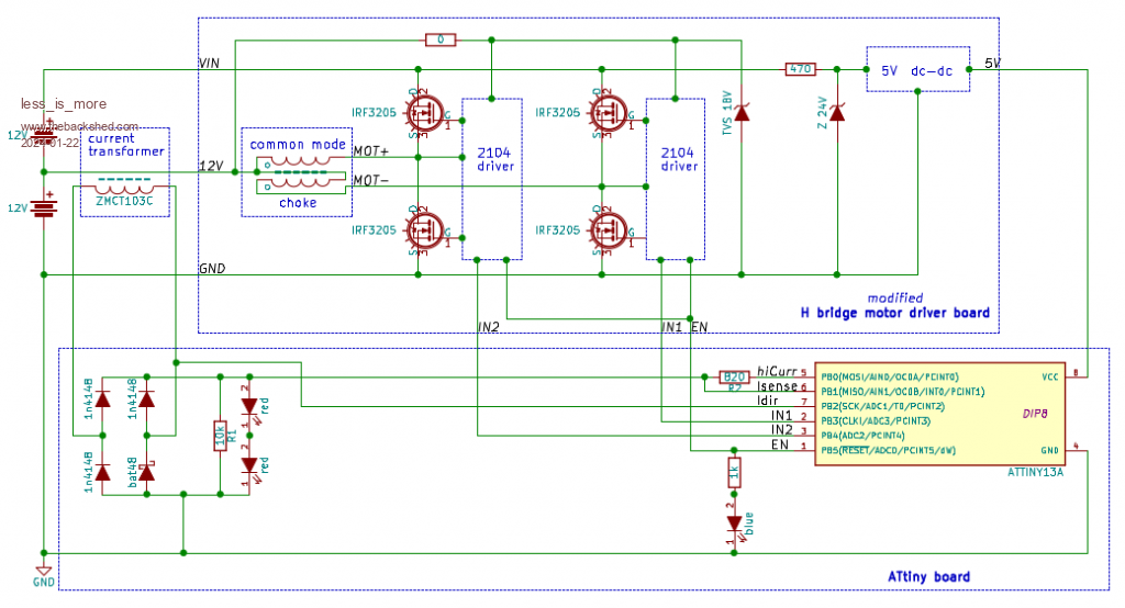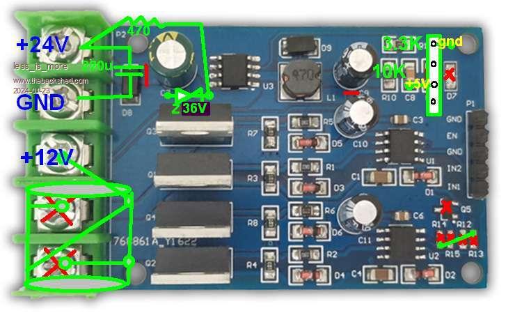 - the MOT+ and MOT- screw PCB connectors are replaced by the common mode choke connected in differential mode to the 12V connector