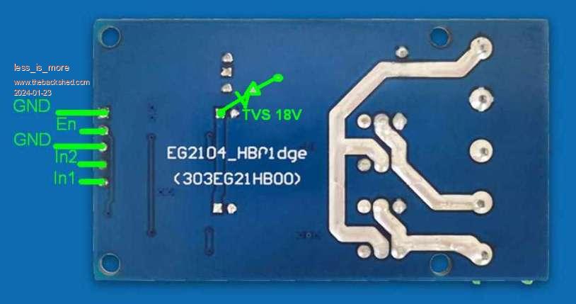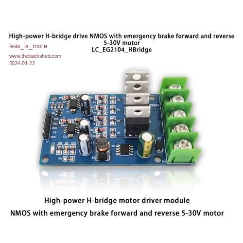 It has 2 half bridges with 3205 mosfets (80A max), and their respective 2104 drivers, a switching input for each half bridge, and a common enable input. Also found on the board is a XL7005 switching regulator, which  outputs 12V for the 2104 drivers.