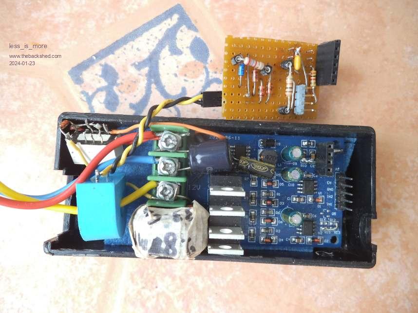 - 2 resistors as current transformer burden. 10k to set the starting (Imin) level, the other one which can be disconnected sets the overcurrent shutdown (Imax) level.