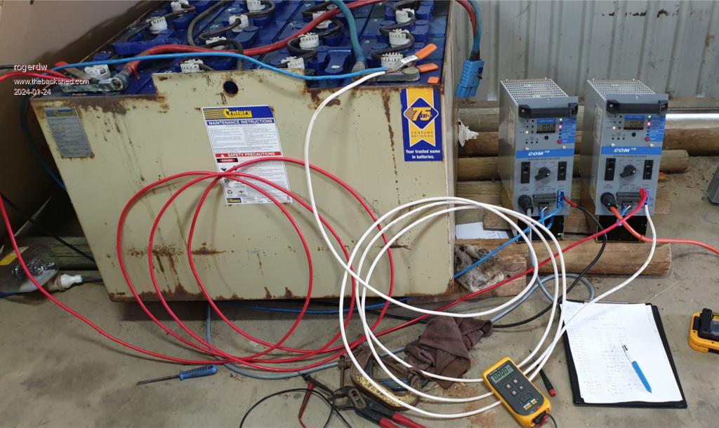The UPS batteries I was using along with a power supply topping them up was not really suitable for going much further than the 1,450 watts  …  so it was time for a forklift battery  …  something I’ve been planning on for probably 10 years.
