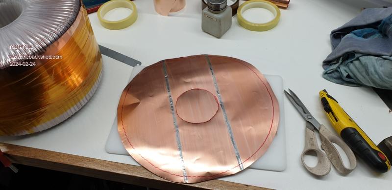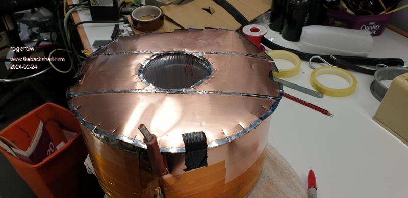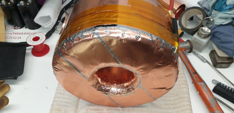 I figured it should be easy enough as I had plenty of the shielding strip from the unwound Aerosharp toroids  ...  but as Tony pointed out  ...  putting a hundred turns around the thing is just like a hundred turns of wire and even with the earth tapped off near the centre, the ends would have quite high voltage on them.
