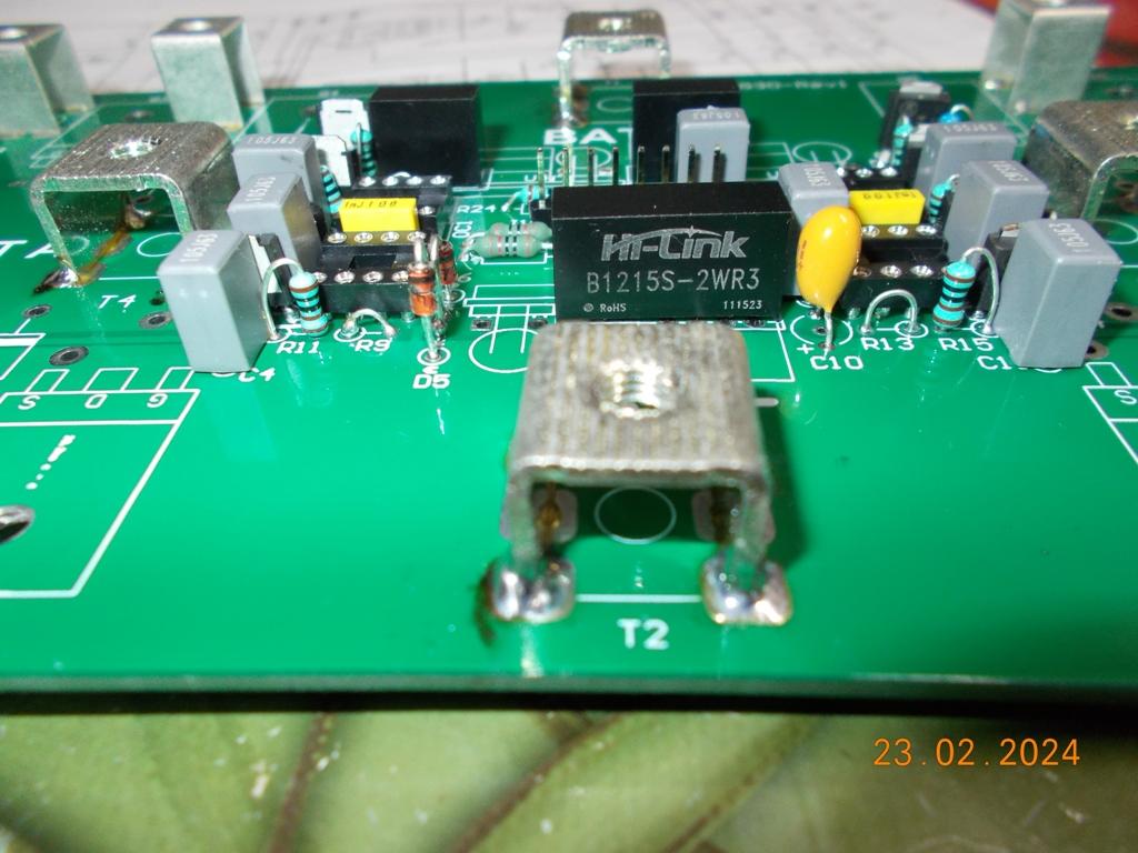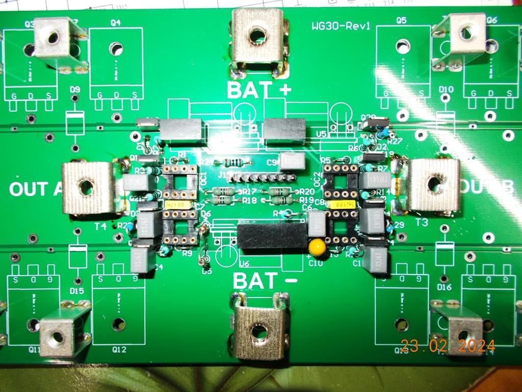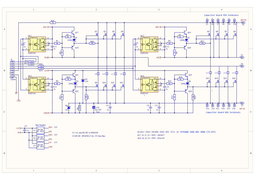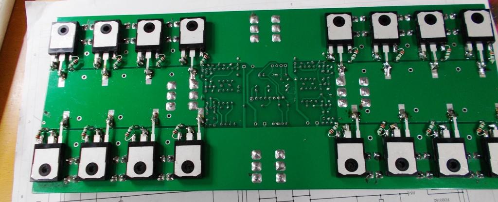 This power board has FOD3180 opto-coupler drivers on the FET power board in close proximity to the FETs, it uses Warpspeeds suggested cross coupled opto drive method and Wiseguy has used isolated gate driver power supplies for the high and low side.