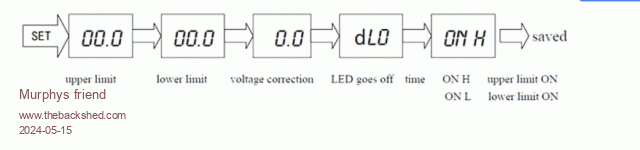 I set mine so the relay comes on at the upper limit, as this only happens in a fault condition to disconnect the MPPT (via Kilovolt Rly.) one can save about 1 W of standby power. The relay contact is SPST so the Kilovac can be connected to be on or off when the A 30 Rly is ON.
