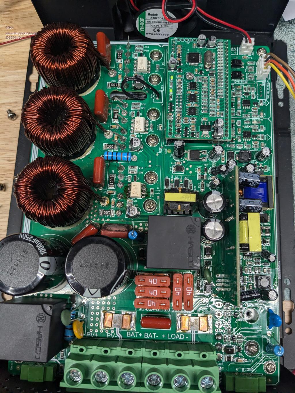 The power part of the MPPT uses a very similar circuit to Poida's thread, except it uses 3 inductors and for each inductor, one dual diode and mosfet.  I thought at first that the unit was only using one inductor at lower power levels, but the board had a conformal coating, I I was just not pressing hard enough with the scope probe.  When I pressed hard, I managed to short the ground tab on the probe, to one of the switching transistor/diodes and managed to vaporize the leads.  Fortunately it only killed the Mosfet driver chip, and I happened to have one in a bad inverter on hand.