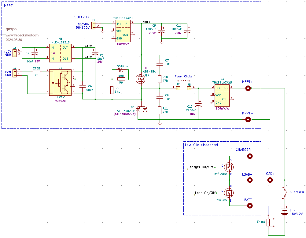 I'm a little perplexed about the charger and load switching and why it is configured that way. For instance if the circuit breaker is open then turning on the charger FET, it turns on the load - the solar is applied to the load minus the battery ?  If it is charging and you turn the Load off it stops charging but the load is still be powered by the MPPT.  Why is the Load switch not in the Load return lead ? I am not saying anything is wrong with the configuration only that it is not obvious to me what it is up to.