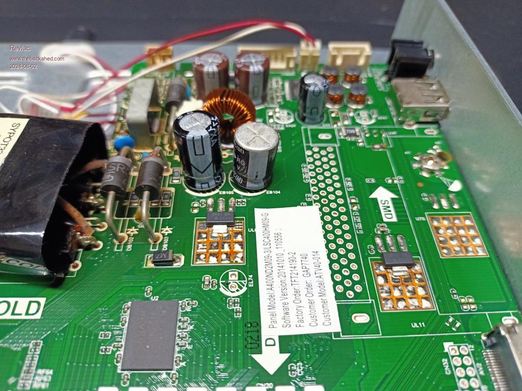The guts of it, well there isn't that much these days, powered it on and could see a dull glow in the plastic lugs on the back of the display and around the back light wires red and white, tested the voltage on the terminal with the red and white wires plugged in on standby it was about 10v, turned the display on and the voltage was about 20v Turned the TV off, removed the connector and turned the TV on again and measured the voltage at the pins, 63v and falling, plugged the back light in again and a bright flash from the back light then dull again.