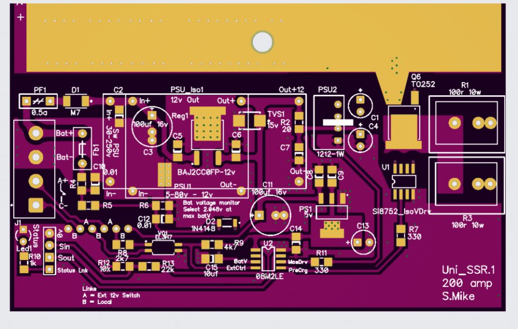 CPU is a Picaxe 08M2LE to provide some voltage measurement and delay timing logic, an opto coupler input is used for switch activation, as the circuit is not that complex, I don't have a schematic drawing as yet, but will do one at some stage. PCB 105x148mm fits inside readily available low profile plastic cases.